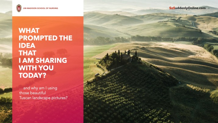 Why the picture of Tuscan landscape? I didn’t really answer that question (as promised on slide 2); I was planning 45 minutes, but got reminded by the session chair it was meant to be 30 mins for the session, and 15 for questions… so I skipped the fun (but nonessential) reference to the journey… When McTighe & Wiggins introduced their original approach for the first time, they explained that [Curriculum design] “is analogous to travel planning. Our frameworks should provide a set of itineraries deliberately designed to meet cultural goals rather than a purposeless tour of all the major sites in a foreign country.” [p.14] I think this is an apt and useful metaphor; at the same time it only works for tourists who follow established itineraries. But sometimes learners are not so much tourists (with a fixed trip plan = learning objectives), as they are explorers, whose task is to explore an area previously unknown to them, with a specific focus or interest: most entry-level-to-intermediate survey courses are like that – rather than memorizing names of authors and titles of works, it is experiencing the literature, art, or tropical forest in a biology class, that is the focus – with specific outcomes more open and less predictable (and, to the chagrin of administrators, not very quantifiable). Similarly, in advanced graduate courses sometimes the whole point is to explore the unknown area of knowledge with expert guidance of the instructor (to reference the much-cliched sage > guide comparison), to later create your own itinerary (for example, a dissertation topic). So that’s why I used some nice landscape photos – I thought they could illustrate the central “journey metaphor” for the leaning process! 🙂