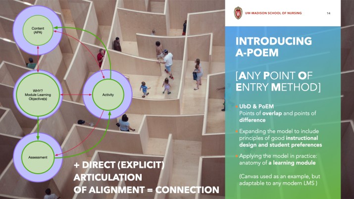 First, it stresses the flexible order (sequence) of these elements (note the red two-directional arrows on the included diagram), allowing to use any of them as a starting point for the design of the instructional unit (for example, a course module), as long as all remain bi-directionally aligned. Second, it introduces “safeguard elements”, such as explicitly articulated alignment of module elements, which is shared with students; and carefully calculated approximate workload indicators, that include anticipated time spent on each activity, and make sure that course elements are aligned not only among themselves (objectives – activities – assessments), but also with administrative / accreditation requirements for the course, for example, assigned number of credit-hours required, or specific accreditation criteria.