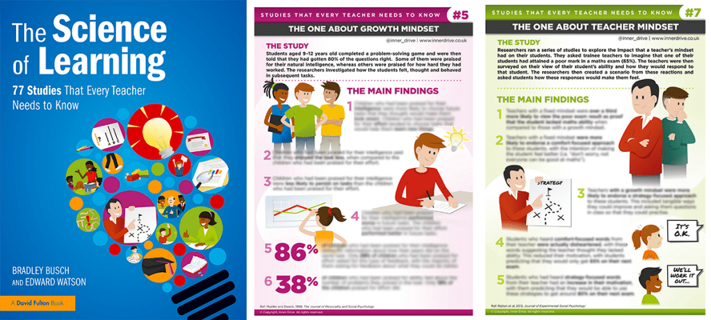 These two books, are similar if you look at their titles, and yet very different, if you glance at the pages, even very quickly. Both are published by UK publisher David Fulton (1836), which since 2006 has become a part of Routledge, a part of perennially-troubled Taylor & Francis. Looking a the titles alone, both books have a superficially similar focus: to translate solid educational research, into practical guidelines and recommendations for classroom and curriculum development practice. The 2019 Busch & Watson’s The science of learning: 77 studies that every teacher needs to know is a very colorful, illustrated collection whose title would better explain its content if it ended with an additional “about”: the studies and research papers are more signalled than really discussed (so you get to know a little about them), with a focus on practical implications for in-class practice. Each study is summarized in a highly visual “poster style” page, with a little additional commentary on the next page or two. I find this book useful as a quick “pointing” reference that allows me to direct attention to a specific study, and there is a very brief one-minute, colorful poster for it. If you need to communicate the key idea to someone (for example a group of instructors in a workshop), and you happen to know that the research is solid, this is very handy. But there is a non-obvious downside: the summaries tend to strongly affirm research, even when its results have more recently been questioned, or when its application may be more complex and limited (boundary conditions) than the summary lets on… For example both #5 and #7 focus on Mueller/Dweck growth mindset, and while the summary truthfully states that “Since this study, many different researchers have studied the impact of having a growth mindset. Some, though certainly not all, have found that having a growth mindset leads to better grades.” (p. 14, emphasis mine), it tends to seriously understate any controversies (see Warne) and avoids making things complicated and multidimensional, sometimes at the expense of usefulness of its summary.